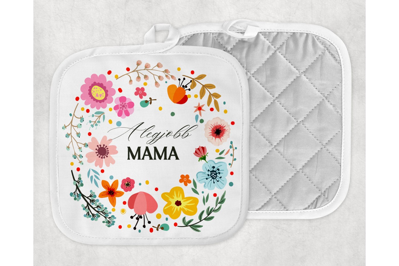 Köszöntsd az Anyák napját ezzel a gyönyörű, virágos mintás edényfogóval, amelyen a "Boldog anyák nap..