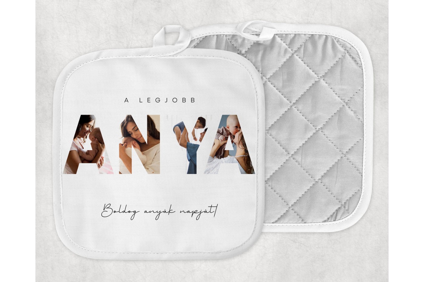 Szerezd be a tökéletes anyák napi ajándékot ezzel a különleges, személyre szabható edényfogóval, amelyet kifejezetten erre az alkalomra terveztünk. A "Legjobb Anya" felirat mellett négy saját fényképet is helyezhetsz el rajta, így minden egyes használatakor felidézhetők azok a felejthetetlen családi pillanatok.