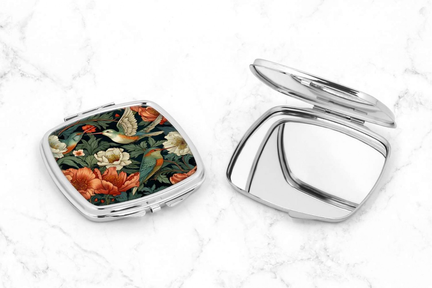 Nincs olyan nő a világon, aki ne szeretne hosszú perceket tölteni a tükör előtt, tökéletesítve megjelenését. A smink az önkifejezés egyik módja, és a tökéletes sminkhez elengedhetetlen egy jó minőségű sminktükör. A táskádban elférő szögletes sminktükör nemcsak praktikus, hanem stílusos is. A William Morris stílusában készült gyurgyalagos grafika egyedi és elegáns megjelenést kölcsönöz a tükörnek, így nem csak hasznos, hanem esztétikus kiegészítője is lesz a mindennapjaidnak.