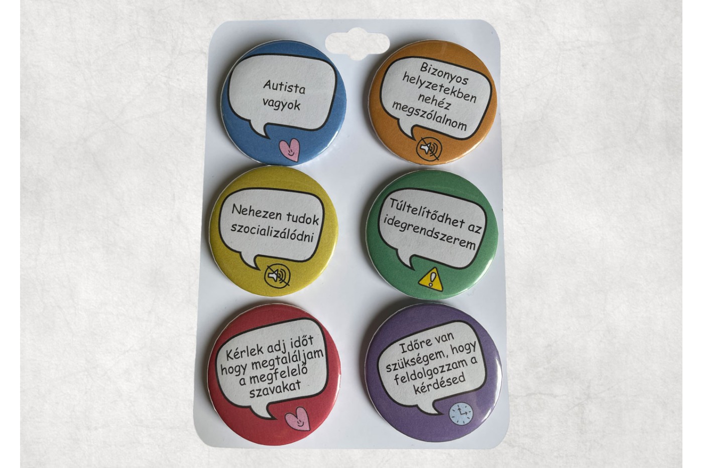 Ez a kitűző szett, melyet autista nagylányom bevonásával alkottunk meg, hat darab 44 mm átmérőjű, gondosan tervezett kitűzőt tartalmaz, mindegyik egy-egy fontos üzenettel, amely segít az autizmus kihívásainak kommunikálásában, anélkül, hogy a viselőjét áldozati szerepbe helyezné.