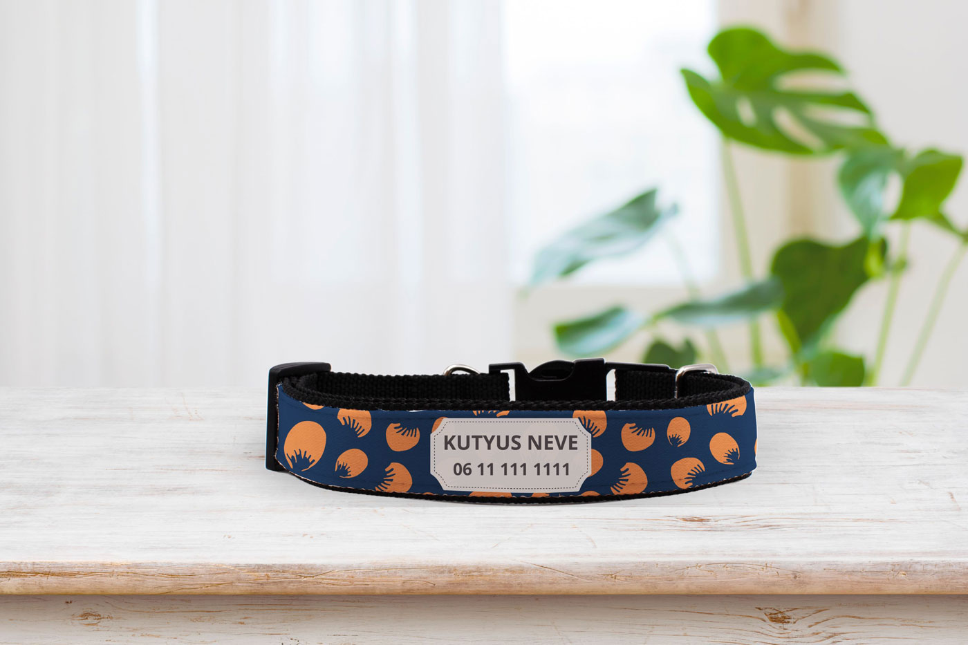 Címkék: modern virágos minta, neves nyakörv, nyakörv névvel, nyakörv telefonszámmal