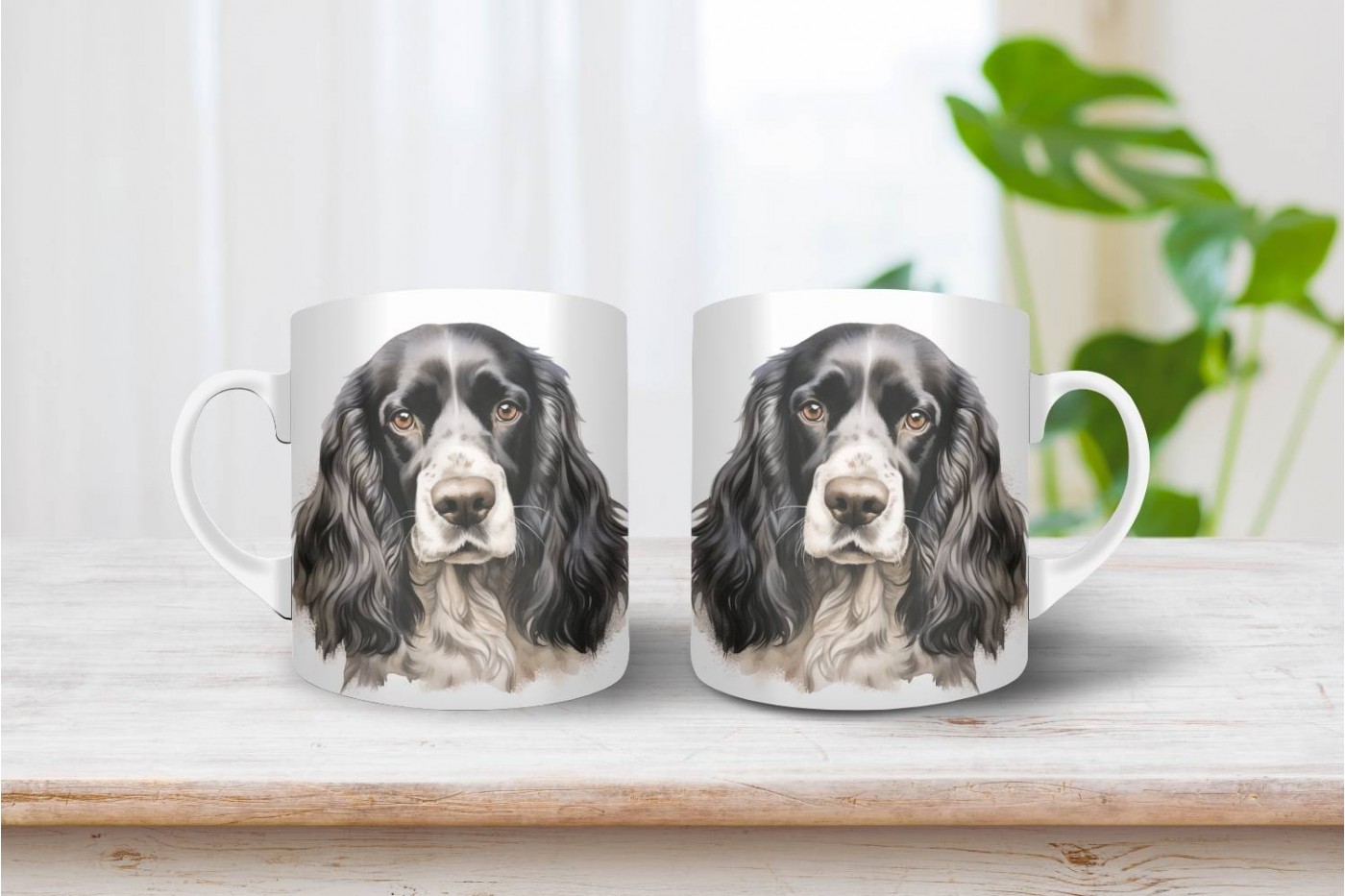 Fedezd fel a fekete-fehér cocker spániel mintás bögrénket, amely tökéletes választás minden kutyabar..