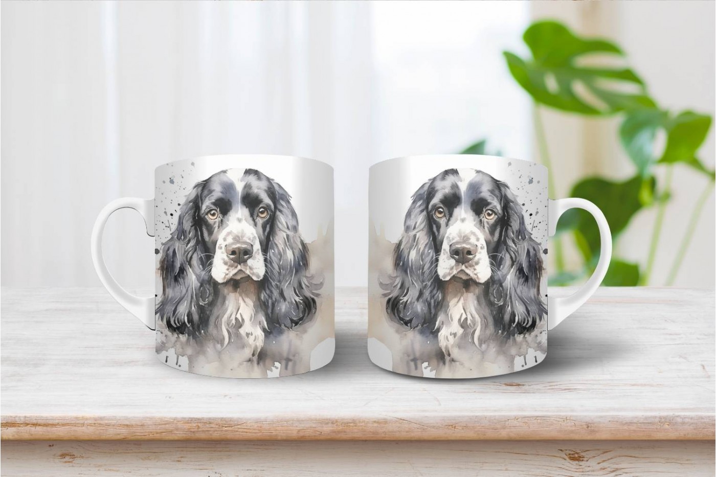 Fedezd fel a fekete-fehér cocker spániel mintás bögrénket, amely tökéletes választás minden kutyabar..
