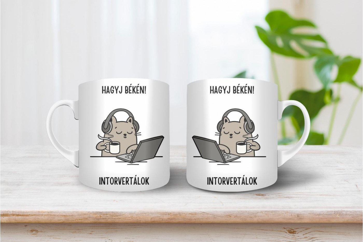 - Design: Morcica, a mogorva macska látható a bögrén, aki a "Hagyj békén! Introvertálok" humoros üzenetet közvetíti.