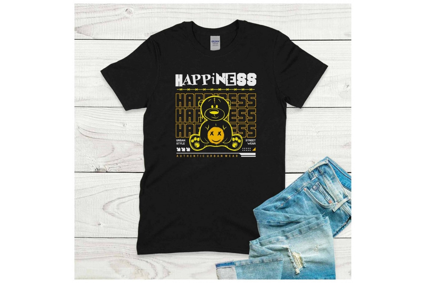 Köszöntsd a napot a "HAPPINESS" feliratos urban streetwear teddy maci pólóval, ami olyan, mintha egyenesen a városi divat szívéből érkezett volna hozzád.