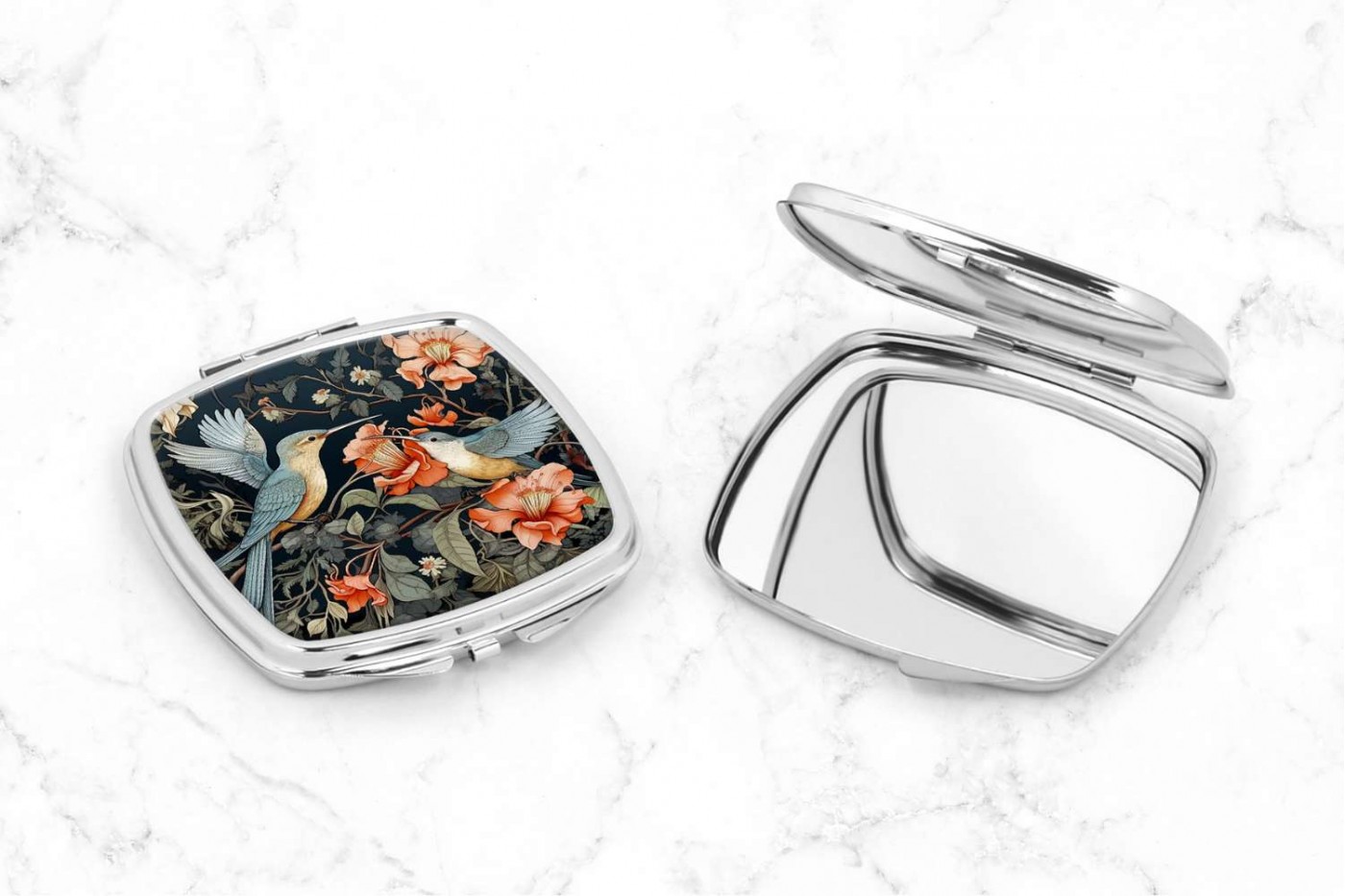 Címkék: sminktükör, kozmetikai tükör, kolibri minta, William Morris stílus, rozsdamentes acél, szublimációs nyomtatás, táskában elfér, ajándék nőknek.