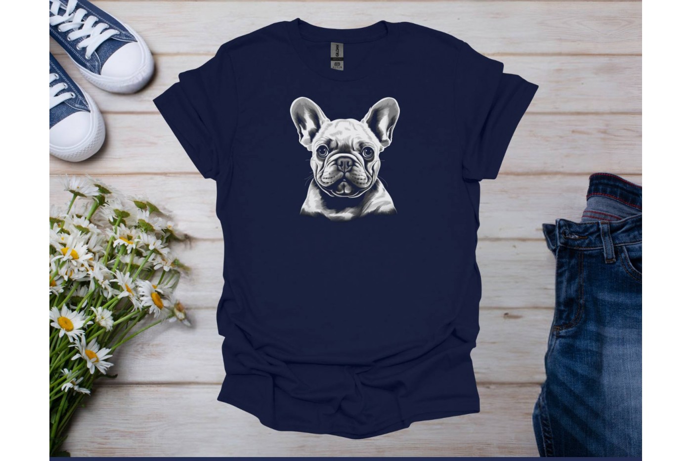 Dobd fel a ruhatáradat ezzel az elragadó francia bulldog pólóval! Ez a sötétkék uniszex póló prémium..