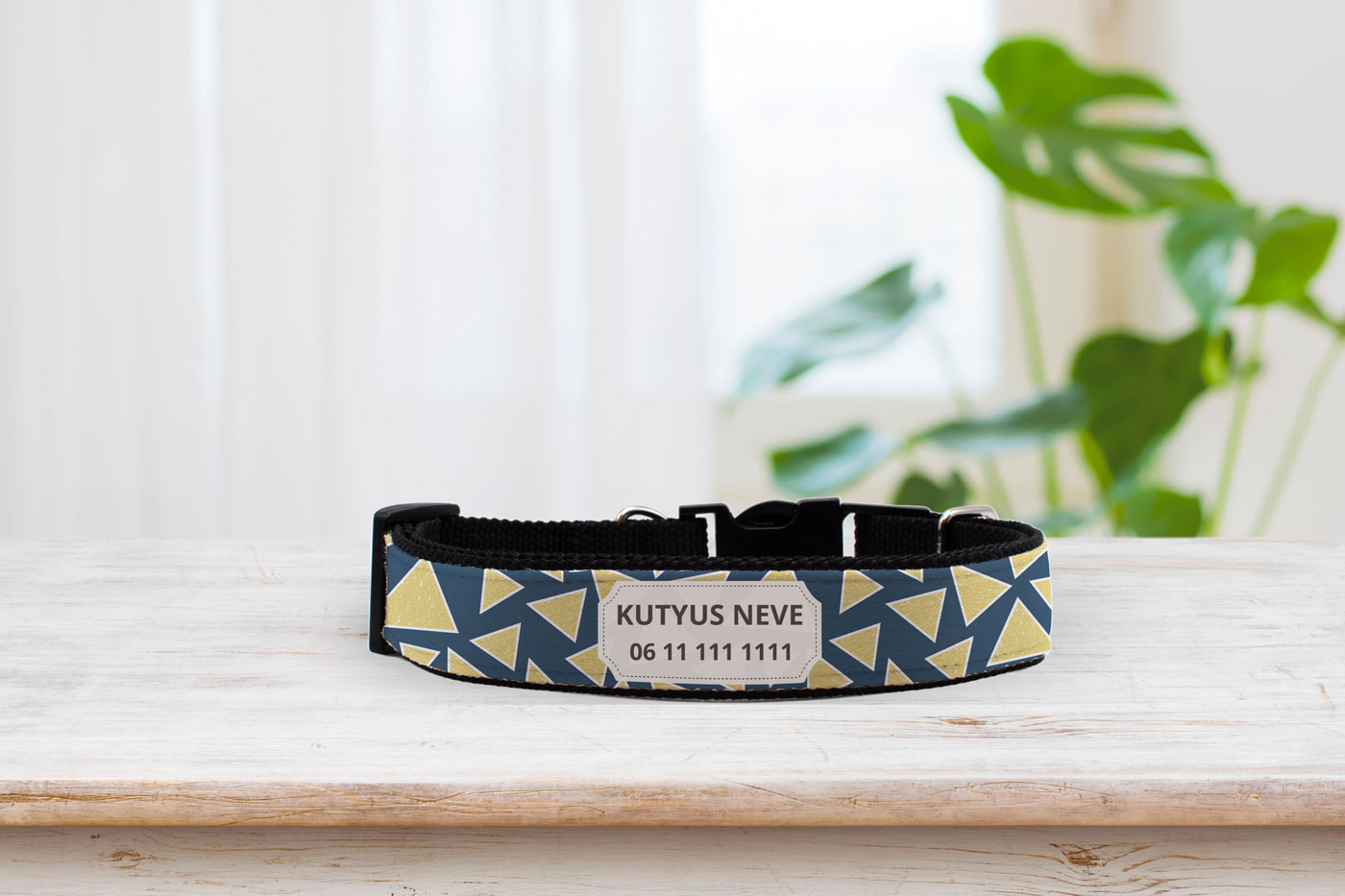 Címkék: modern geometrikus minta, neves nyakörv, nyakörv névvel, nyakörv telefonszámmal