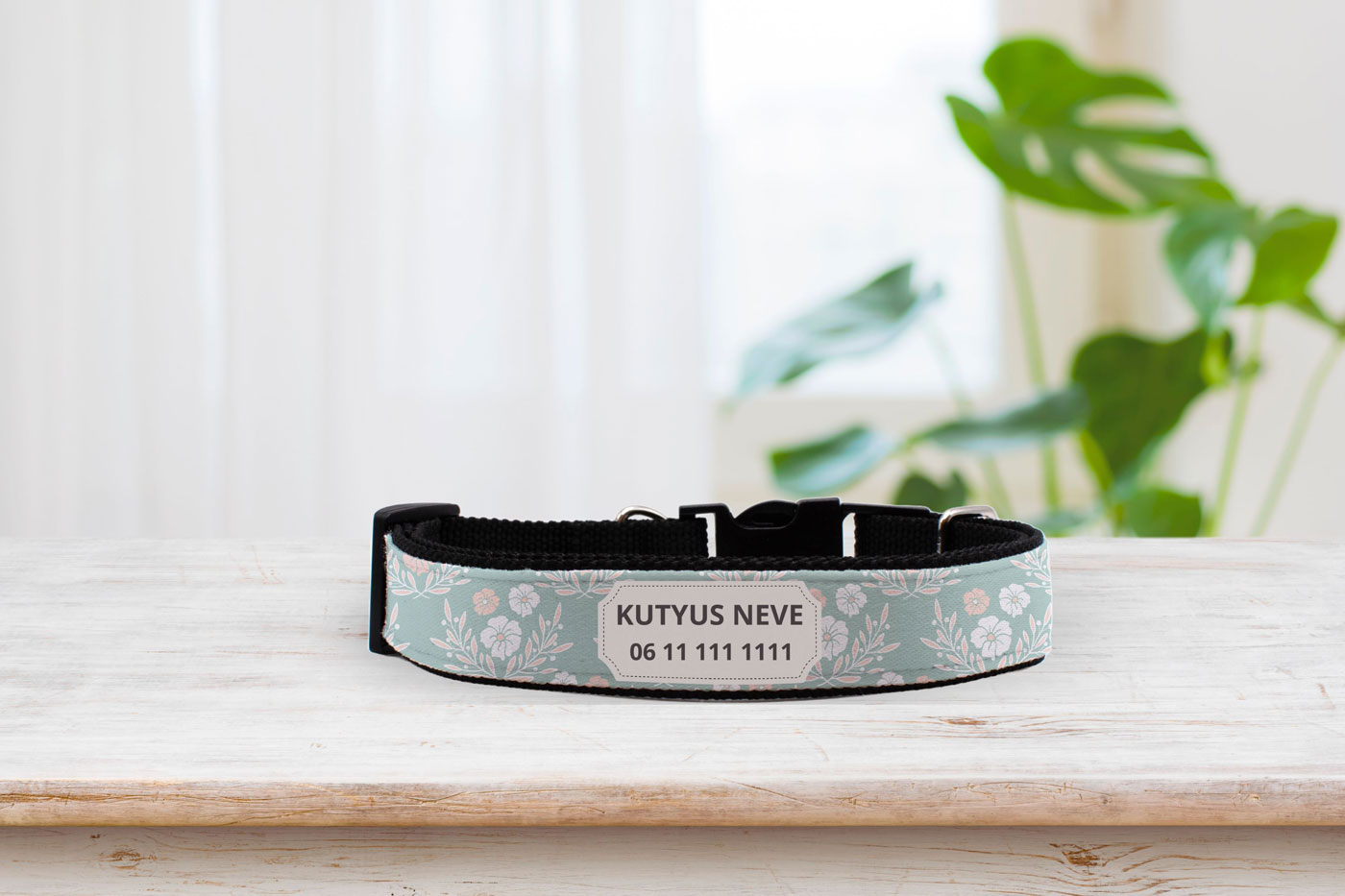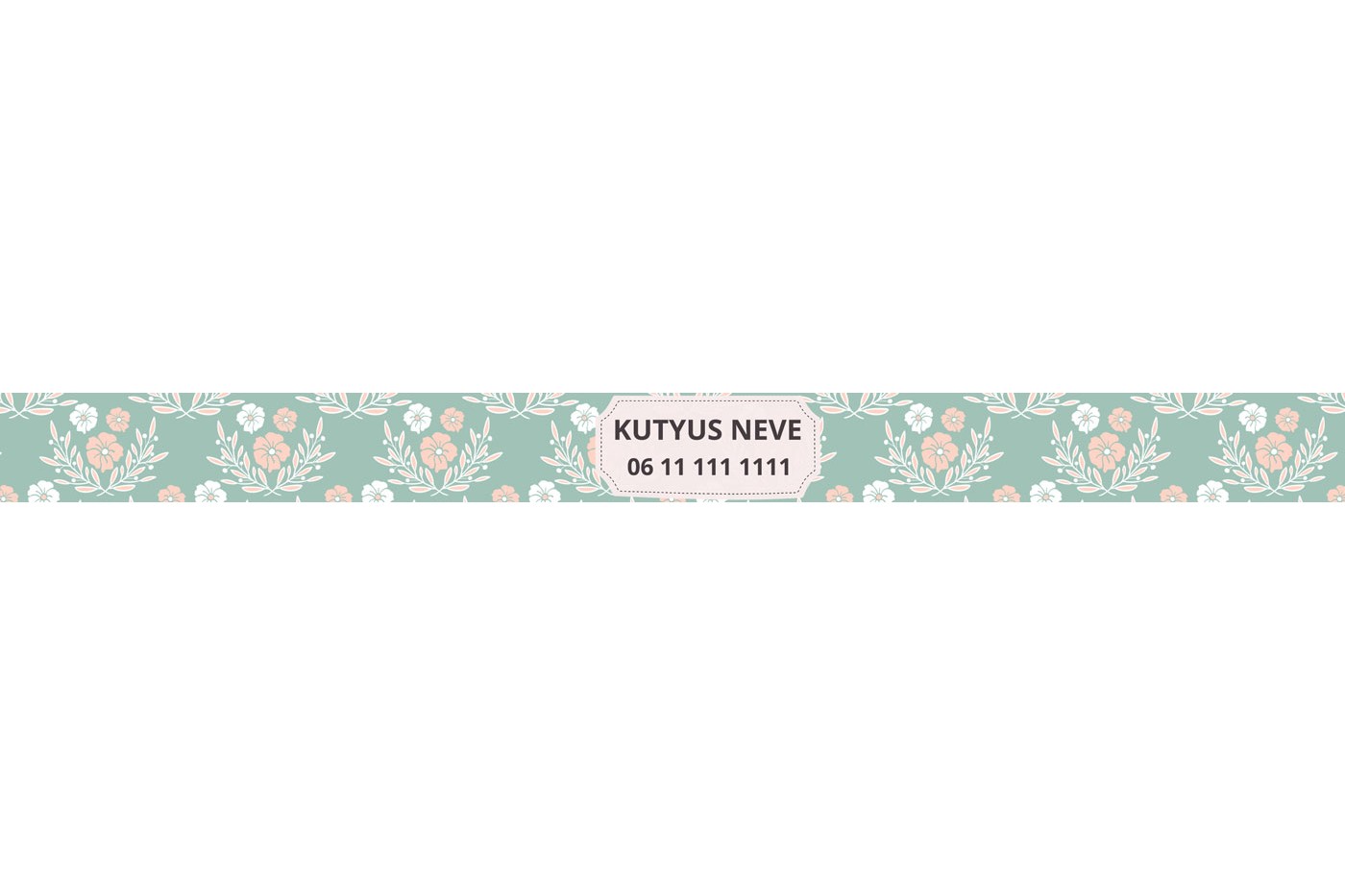 Címkék: modern virágos minta, neves nyakörv, nyakörv névvel, nyakörv telefonszámmal