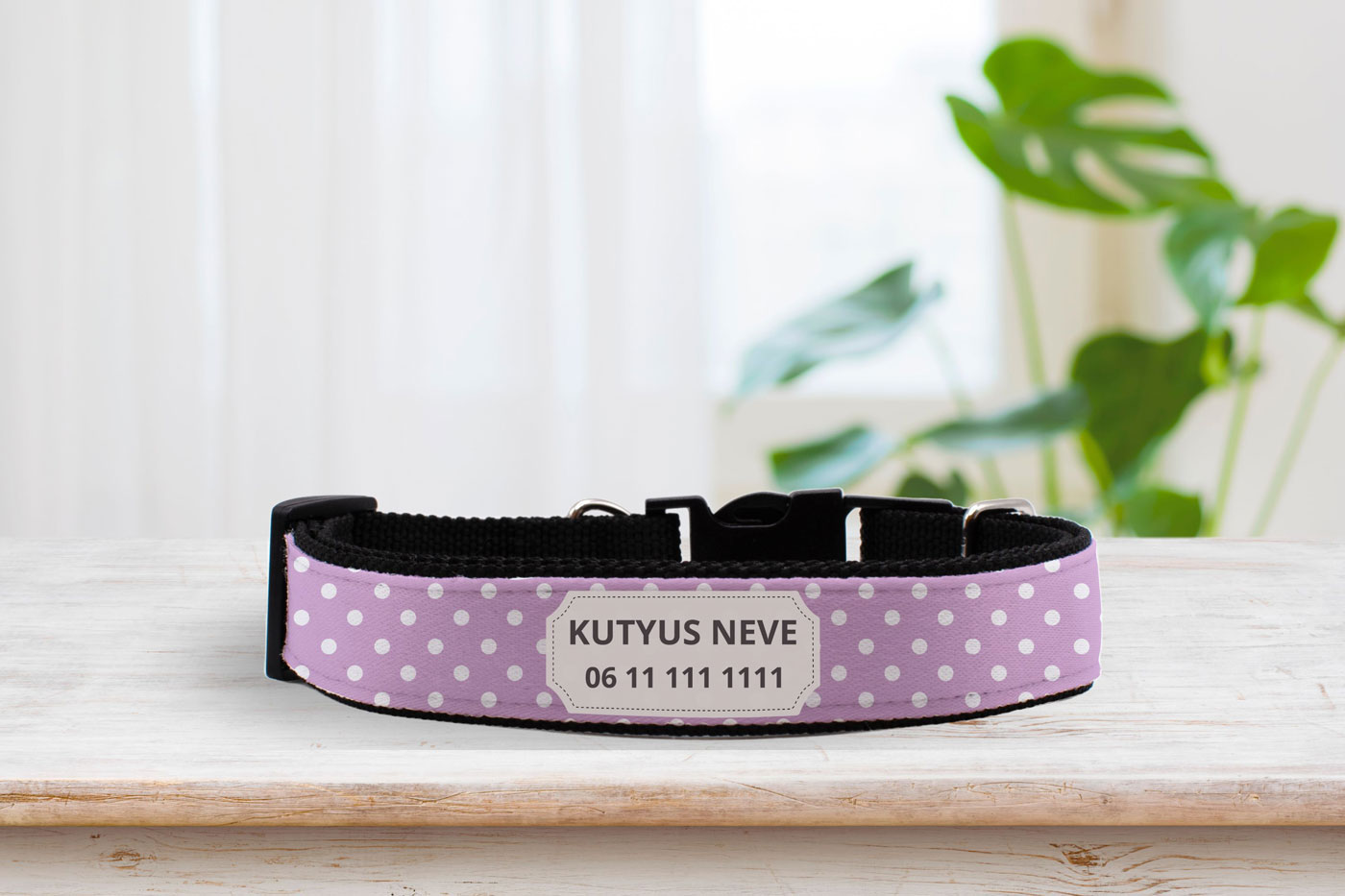 Címkék: pöttyös nyakörv, neves nyakörv, nyakörv névvel, nyakörv telefonszámmal, pasztell-lila