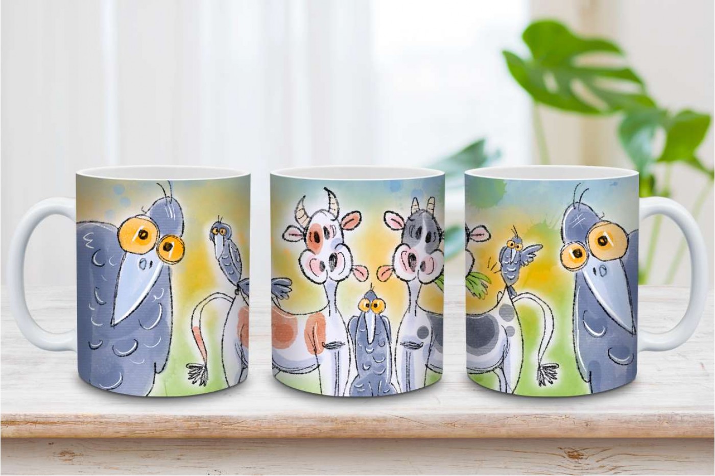 Ez a különleges panoráma varjas bögre mókás, nagy szemű madarakkal és vidám bocikkal készült, akik együtt pózolnak a színes háttéren. A rajzolt karakterek játékos arckifejezése abszolút egyedi hangulatot ad, így tökéletes választás mindenkinek, aki szereti a humoros állatos mintákat és a különleges illusztrációkat.